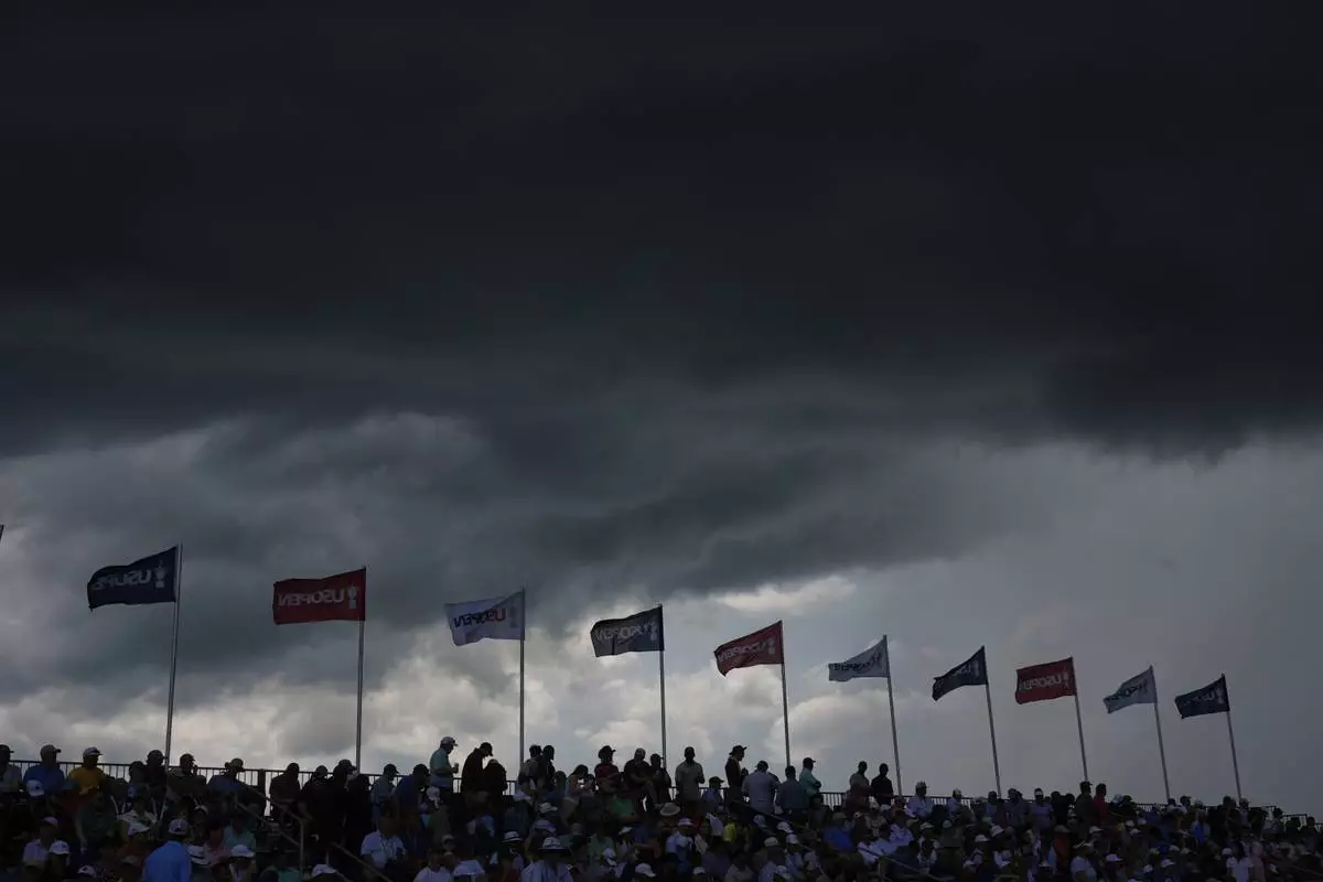 Storms clouds hang over the grandstand overlooking the eighth green during the third round of the U.S. Open golf tournament at Oakmont Country Club Saturday, June 14, 2025, in Oakmont, Pa. (AP Photo/Carolyn Kaster)