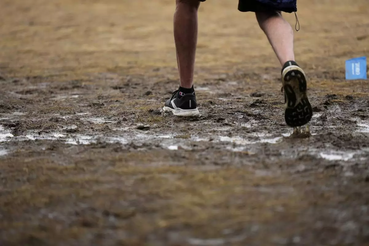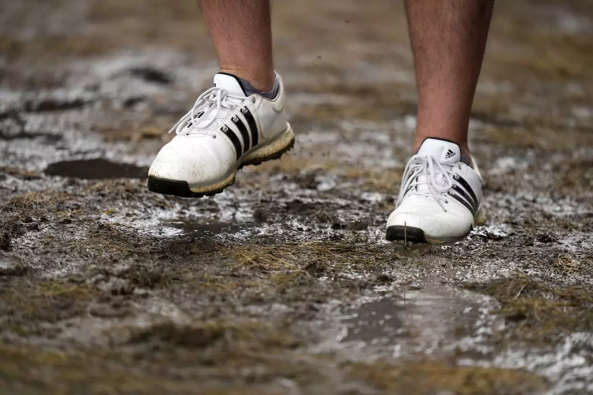 A fan walks through a soggy puddle near the 14th hole during the third round of the U.S. Open golf tournament at Oakmont Country Club Saturday, June 14, 2025, in Oakmont, Pa. (AP Photo/Charlie Riedel)