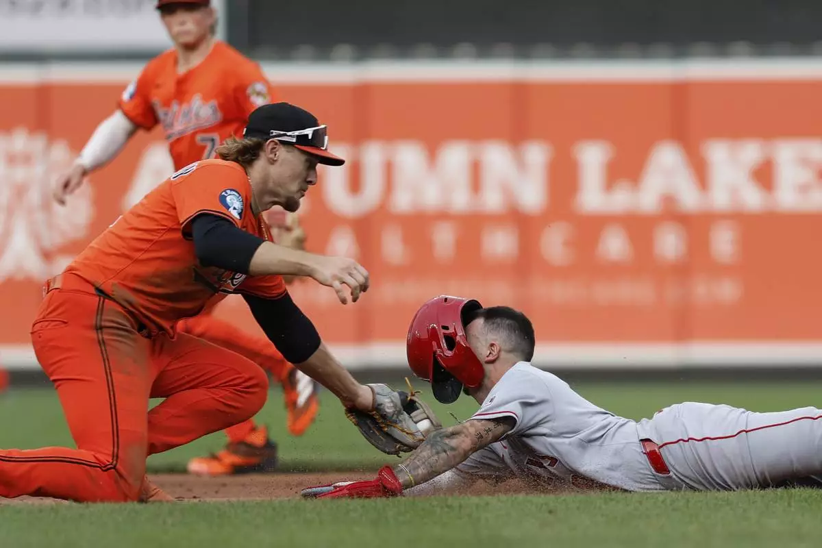 Los Angeles Angels' Zach Neto attempts to steal second base and is tagged out by Baltimore Orioles shortstop Gunnar Henderson during the eighth inning of a baseball game in Baltimore, Saturday, June 14, 2025. (AP Photo/Terrance Williams)