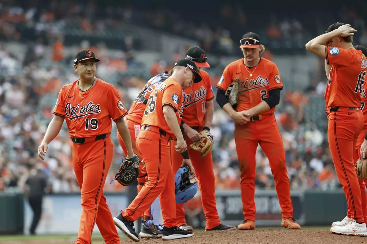 Baltimore Orioles pitcher Tomoyuki Sugano (19) is removed from the game by interim manager Tony Mansolino (36) during the fifth inning of a baseball game against the Los Angeles Angels in Baltimore, Saturday, June 14, 2025. (AP Photo/Terrance Williams)