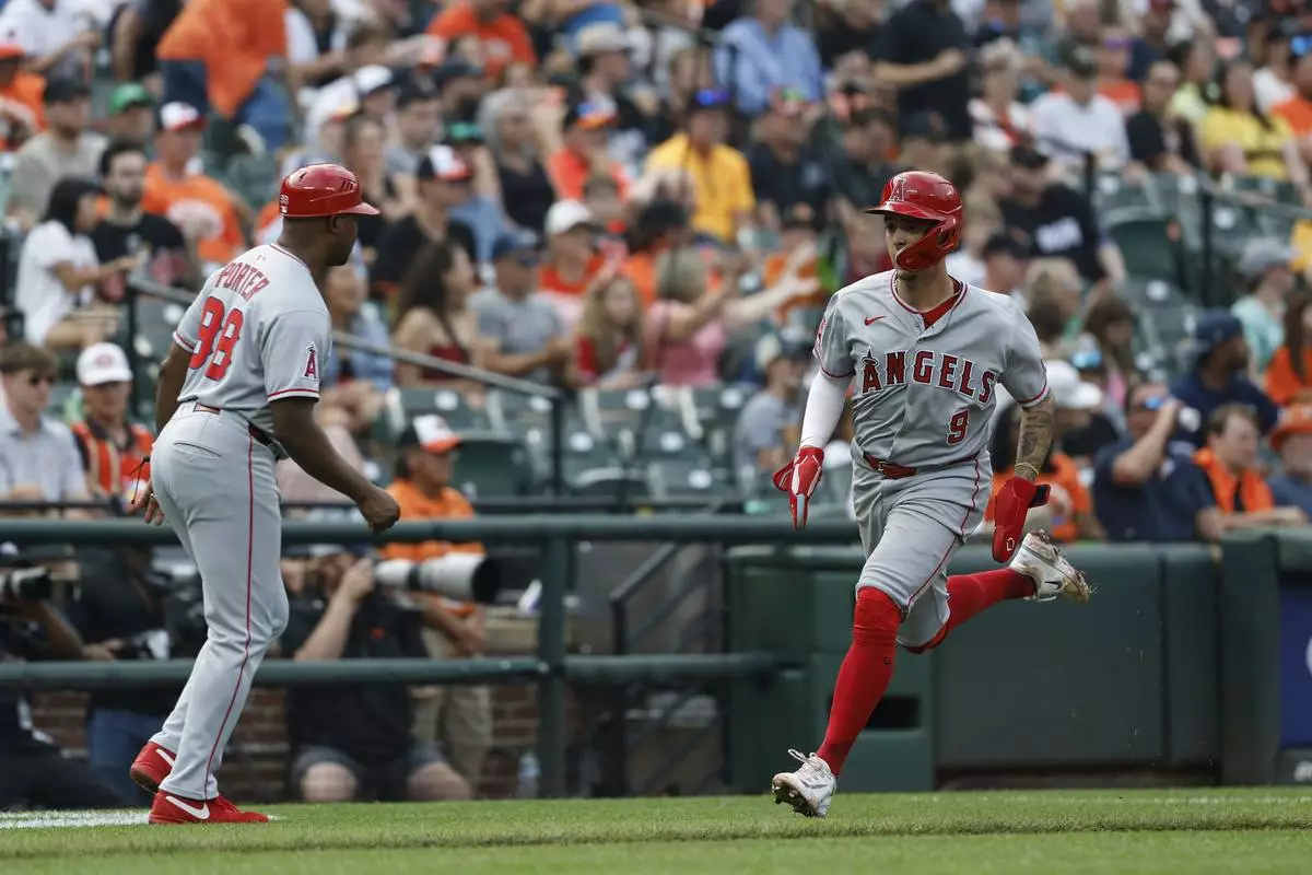 Los Angeles Angels' Zach Neto (9) scores a run on a double hit by Taylor Ward against pitcher Tomoyuki Sugano during the fifth inning of a baseball game in Baltimore, Saturday, June 14, 2025. (AP Photo/Terrance Williams)