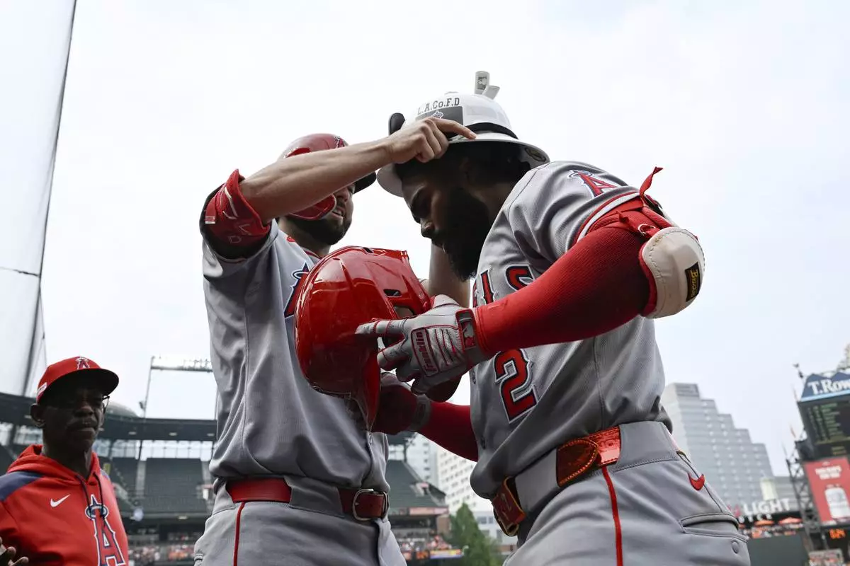 Los Angeles Angels' Luis Rengifo (2) has a firefighters helmet placed on his head by Nolan Schanuel after hitting a solo home run against Baltimore Orioles pitcher Keegan Akin during the sixth inning of a baseball game in Baltimore, Saturday, June 14, 2025. (AP Photo/Terrance Williams)
