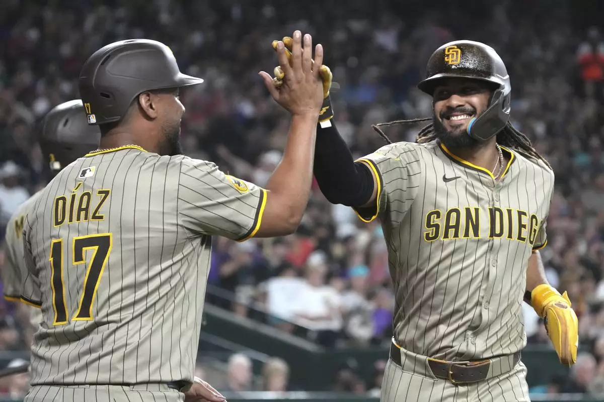 San Diego Padres' Fernando Tatis Jr., right, celebrates with Elias Díaz (17) after scoring on a double hit by Manny Machado in the seventh inning during a baseball game against the Arizona Diamondbacks, Saturday, June 14, 2025, in Phoenix. (AP Photo/Rick Scuteri)