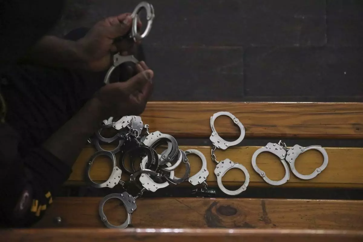 A police officer holds up the handcuffs removed from Colombians and Haitians accused of involvement in the 2021 assassination of Haitian President Jovenel Moise, in court in Port-au-Prince, Haiti, Monday, June 2, 2025. (AP Photo/Odelyn Joseph)