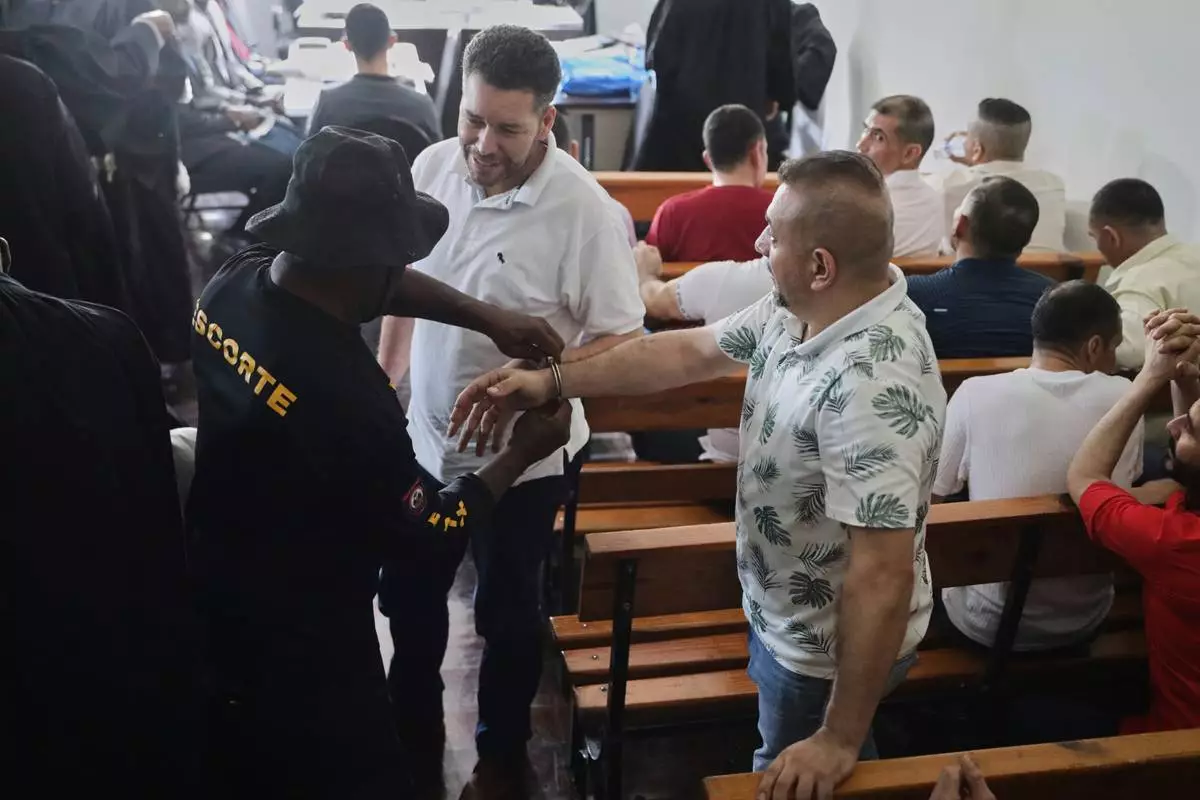 Colombians and Haitians accused of involvement in the 2021 assassination of Haitian President Jovenel Moise get their handcuffs removed in a court hearing in Port-au-Prince, Haiti, Monday, June 2, 2025. (AP Photo/Odelyn Joseph)