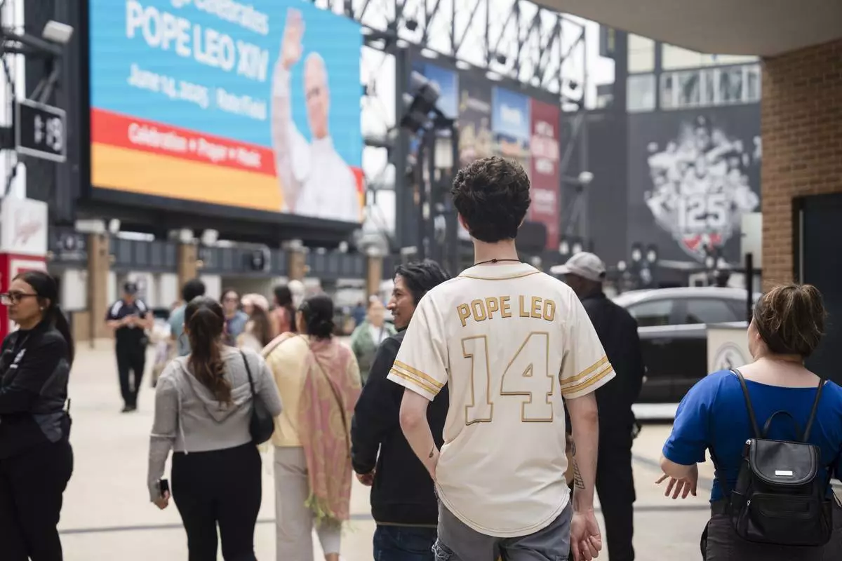 Ethan Peebles wears a Pope Leo jersey during the Archdiocese of Chicago's celebration of Pope Leo XIV at Rate Field, Saturday, June 14, 2025. (Pat Nabong/Chicago Sun-Times via AP)