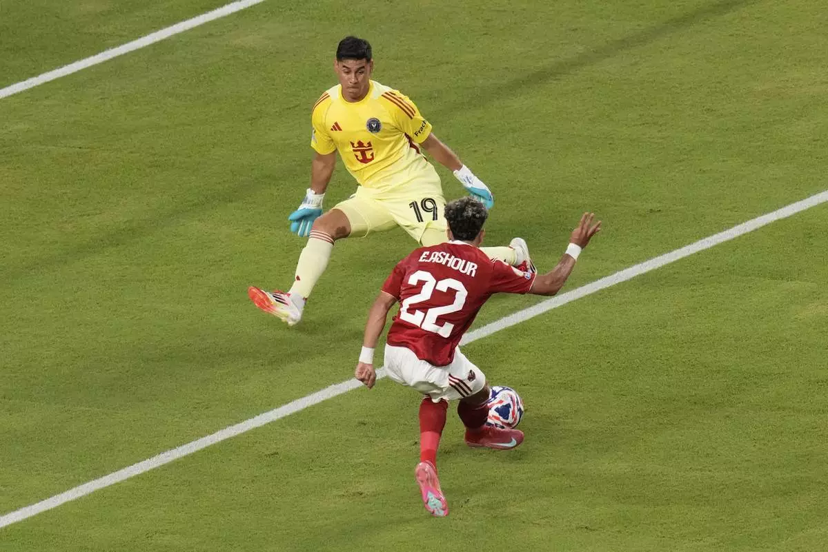 Inter Miami's Oscar Ustari comes out to save at the feet of Al Ahly's Emam Ashour during the Club World Cup group A soccer match between Al Ahly and Inter Miami in Miami, Fla., Saturday, June 14, 2025. (AP Photo/John Raoux)
