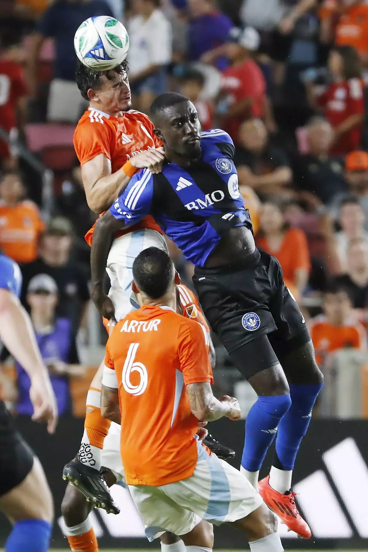 Houston Dynamo defender Felipe Andrade, top left, and CF Montreal forward Prince Osei Owusu, top right, battle for a header as Dynamo midfielder Artur (6) looks on during the second half of an MLS soccer match Saturday, June 14, 2025, in Houston. (AP Photo/Michael Wyke)