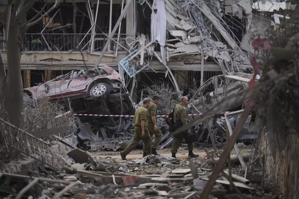 Israeli security forces inspect a destroyed building that was hit by a missile fired from Iran, near Tel Aviv, Israel, Sunday, June 15, 2025. (AP Photo/Ohad Zwigenberg)
