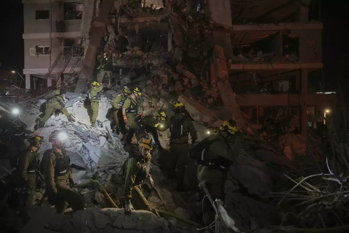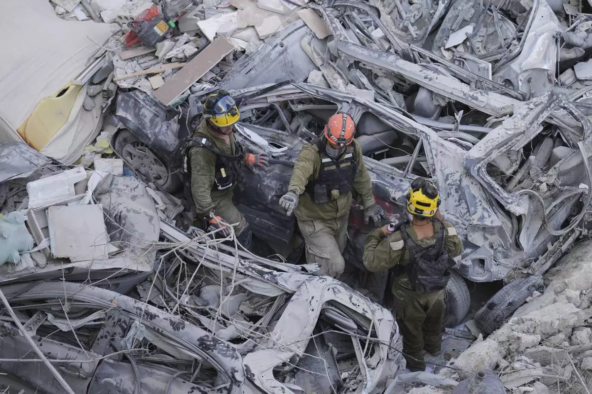 Israeli soldiers dig through rubble to search for survivors in a residential area hit by a missile fired from Iran, near Tel Aviv, Israel, Sunday, June 15, 2025.(AP Photo/Ariel Schalit)