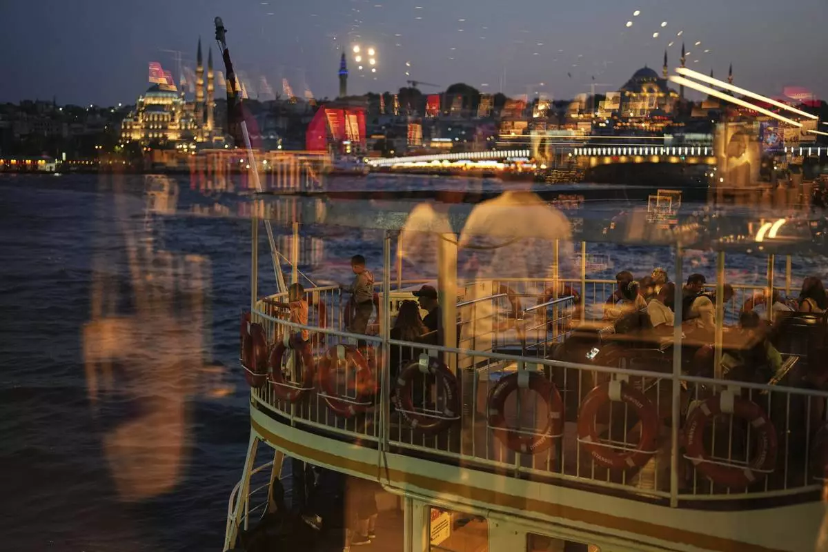 Passengers, seen through a window, get on board a ferry ship before departing from Karakoy ferry terminal, in Istanbul, Turkey, Friday, June 13, 2025. (AP Photo/Francisco Seco)