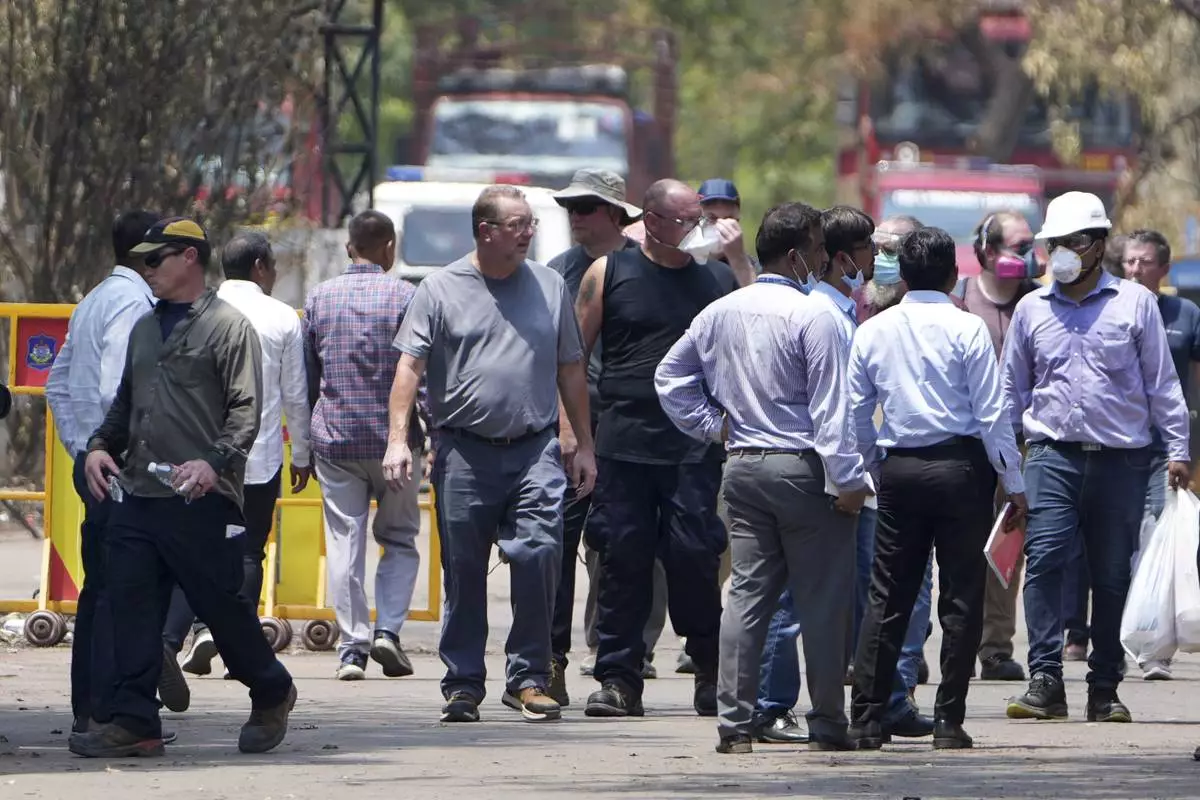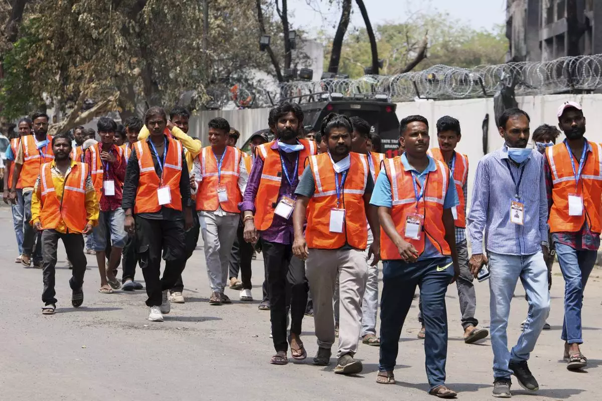 Workers come out from Thursday's Air India plane crash site in Ahmedabad, India, Sunday, June 15, 2025. (AP Photo/Ajit Solanki)