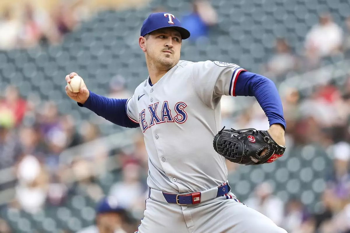 Texas Rangers starting pitcher Tyler Mahle (51) delivers against the Minnesota Twins during the first inning of baseball game Tuesday, June 10, 2025, in Minneapolis. (AP Photo/Matt Krohn)
