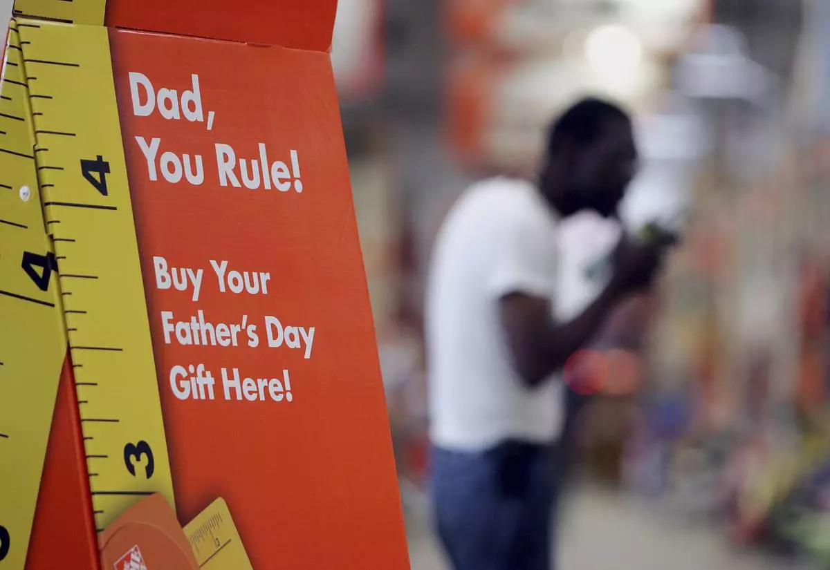 FILE - A sign advertises Father's Day gifts as a shopper buys building materials in the background at Atlanta Home Depot store, June 8 , 2006. (AP Photo/John Bazemore, File)