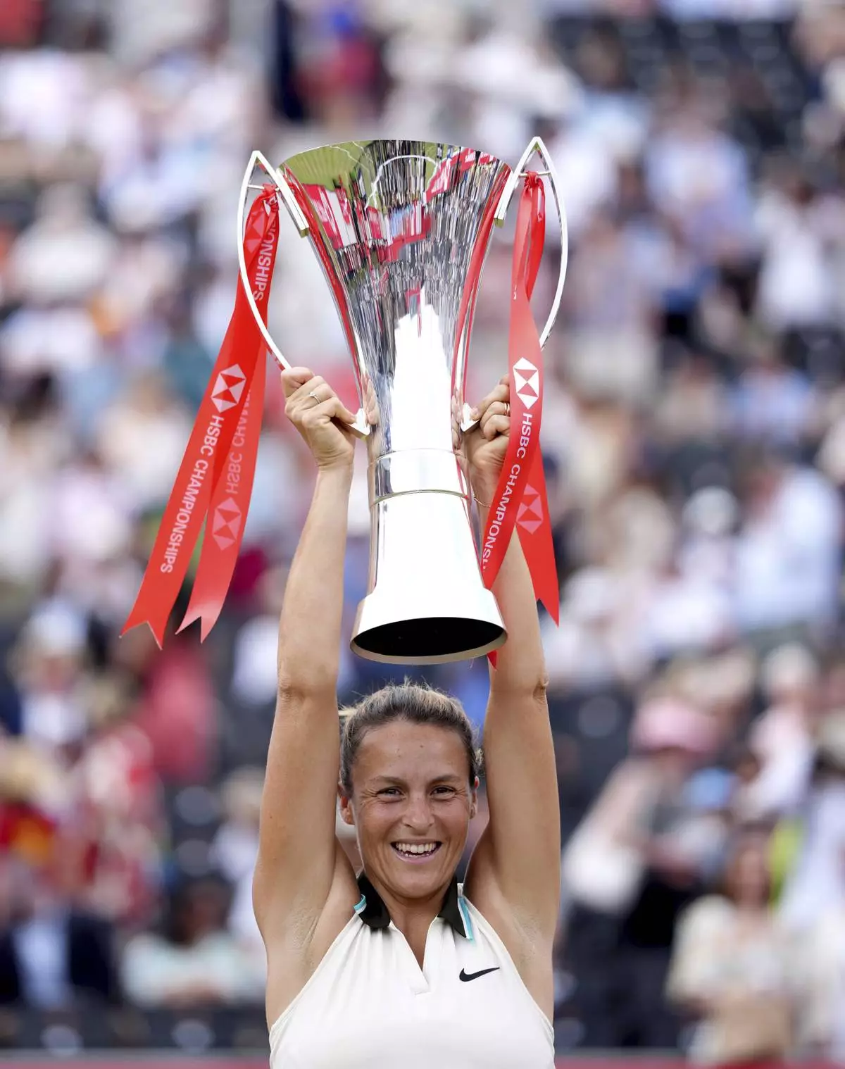 Tatjana Maria of Germany holds the trophy after winning the women's final tennis match against Amanda Anisimova of the United States at The Queen's Club grass court tennis championships in London, Sunday, June 15, 2025. (Adam Davy/PA via AP)