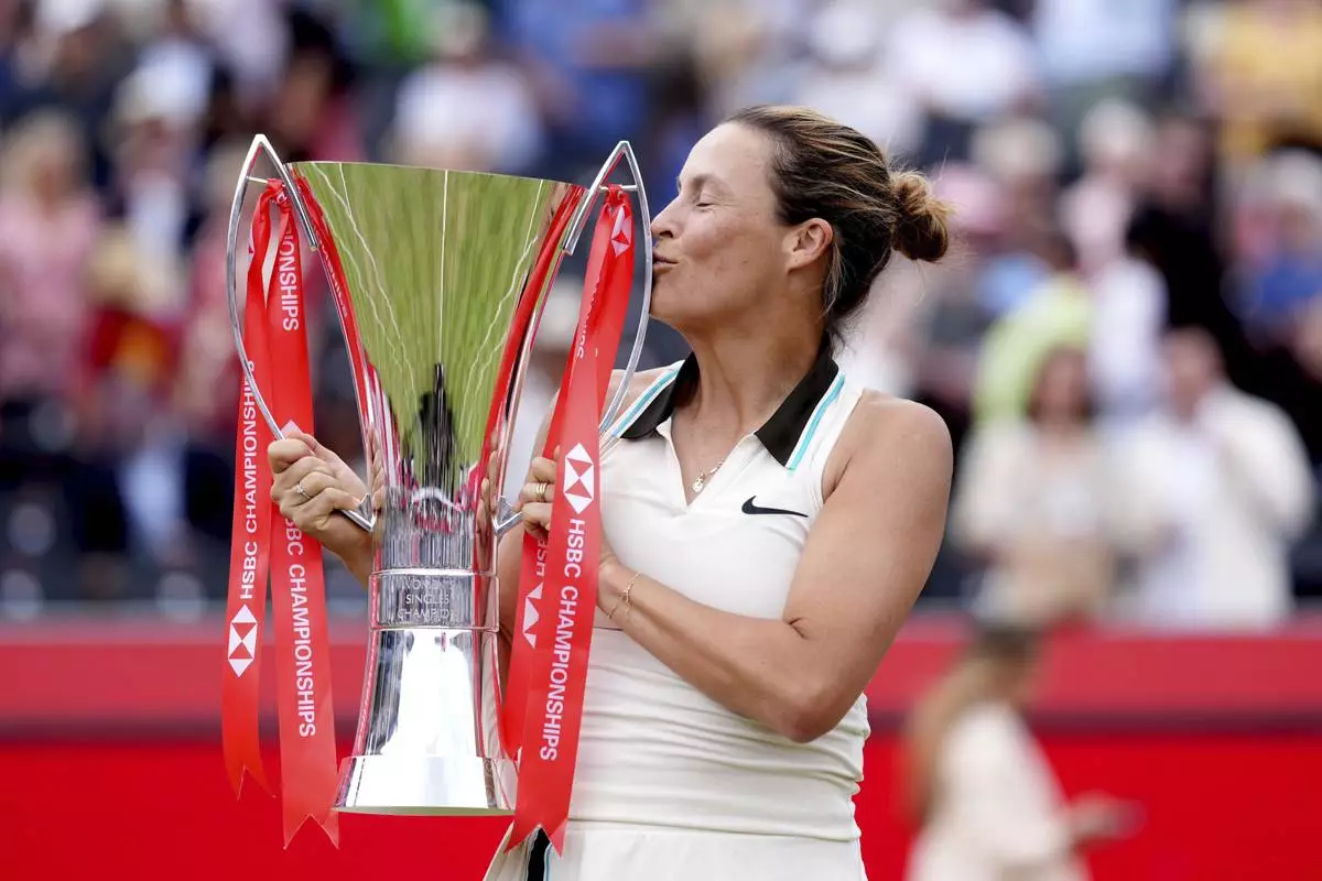 Tatjana Maria of Germany kisses the trophy after winning the women's final tennis match against Amanda Anisimova of the United States at The Queen's Club grass court tennis championships in London, Sunday, June 15, 2025. (Adam Davy/PA via AP)
