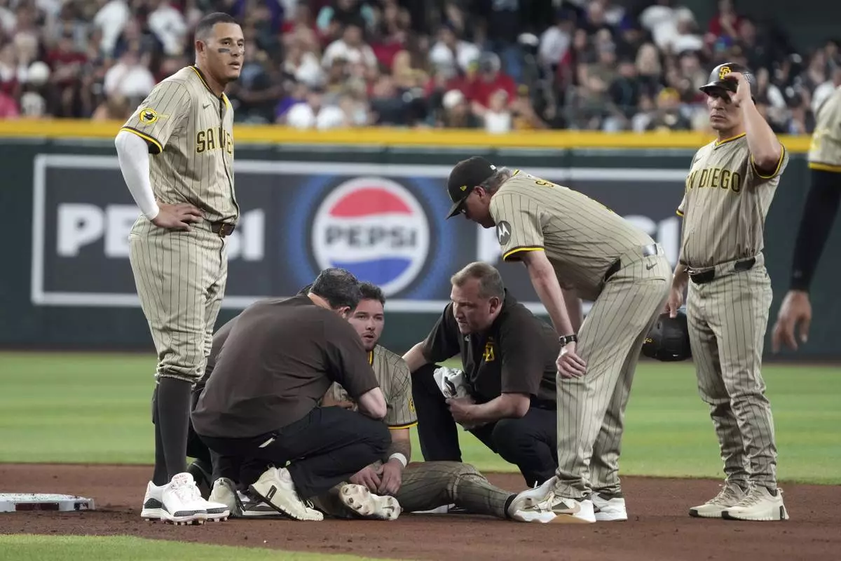 San Diego Padres' Jackson Merrill, third from left, is helped by trainers after being tagged out by Arizona Diamondbacks second baseman Ketel Marte (not shown) while trying to steal second in the seventh inning during a baseball game, Saturday, June 14, 2025, in Phoenix. (AP Photo/Rick Scuteri)