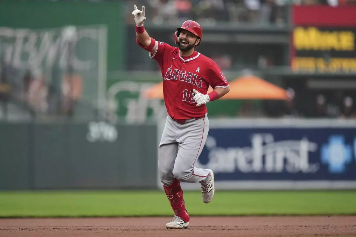 Los Angeles Angels' Nolan Schanuel rounds the bases after hitting a home run during the first inning of a baseball game against the Baltimore Orioles, Sunday, June 15, 2025, in Baltimore. (AP Photo/Stephanie Scarbrough)