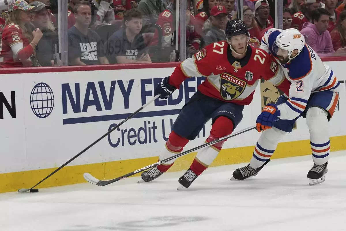 Florida Panthers center Eetu Luostarinen (27) defends against Edmonton Oilers defenseman Evan Bouchard (2) during overtime in Game 4 of the NHL hockey Stanley Cup Final Thursday, June 12, 2025, in Sunrise, Fla. (AP Photo/Lynne Sladky)