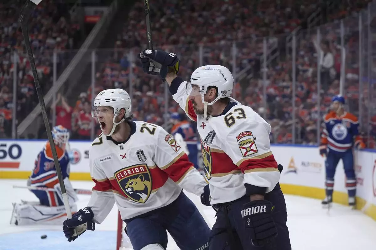 Florida Panthers centrer Brad Marchand (63) celebrates after his goal with teammate Eetu Luostarinen (27) during the first period in Game 5 of the NHL hockey Stanley Cup Final against the Edmonton Oilers in Edmonton, Alberta, Saturday, June 14, 2025. (Darryl Dyck/The Canadian Press via AP)