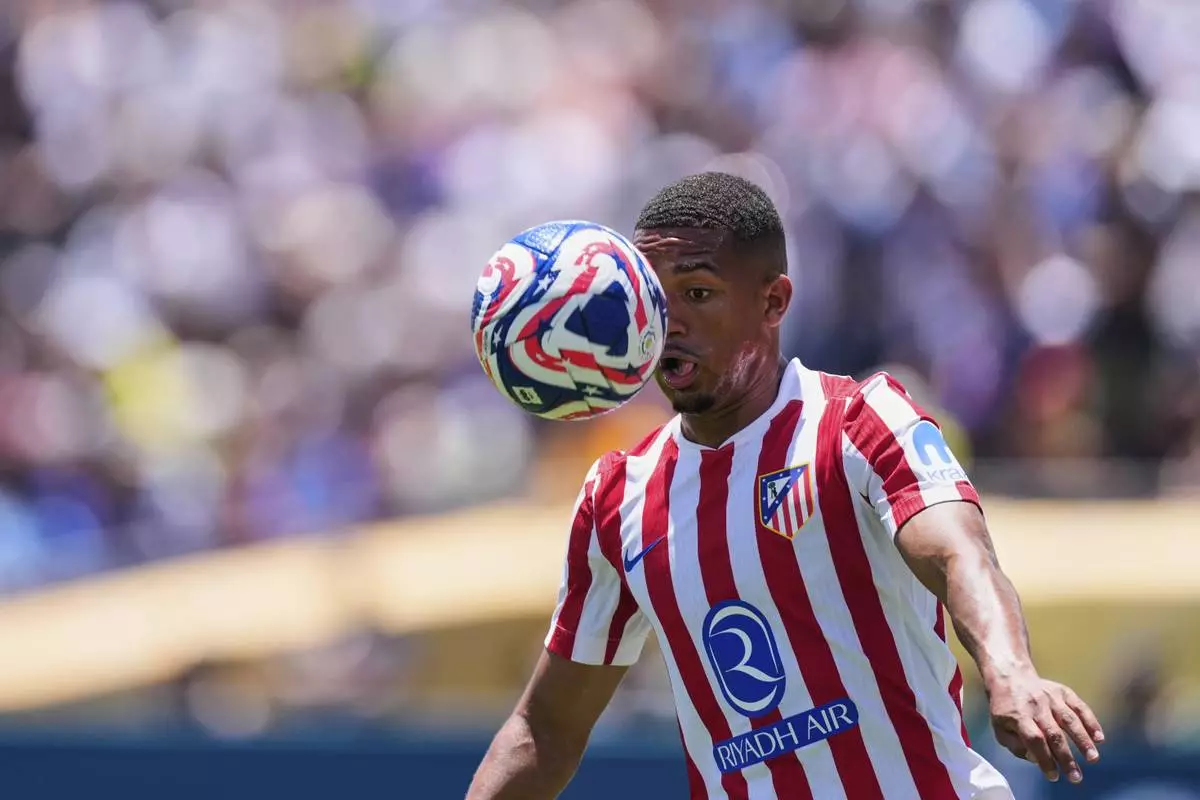 Atletico Madrid's Samuel Lino eyes the ball during the Club World Cup group B soccer match between PSG and Atletico Madrid, in Pasadena, Calif., Sunday, June 15, 2025. (AP Photo/Mark J. Terrill)
