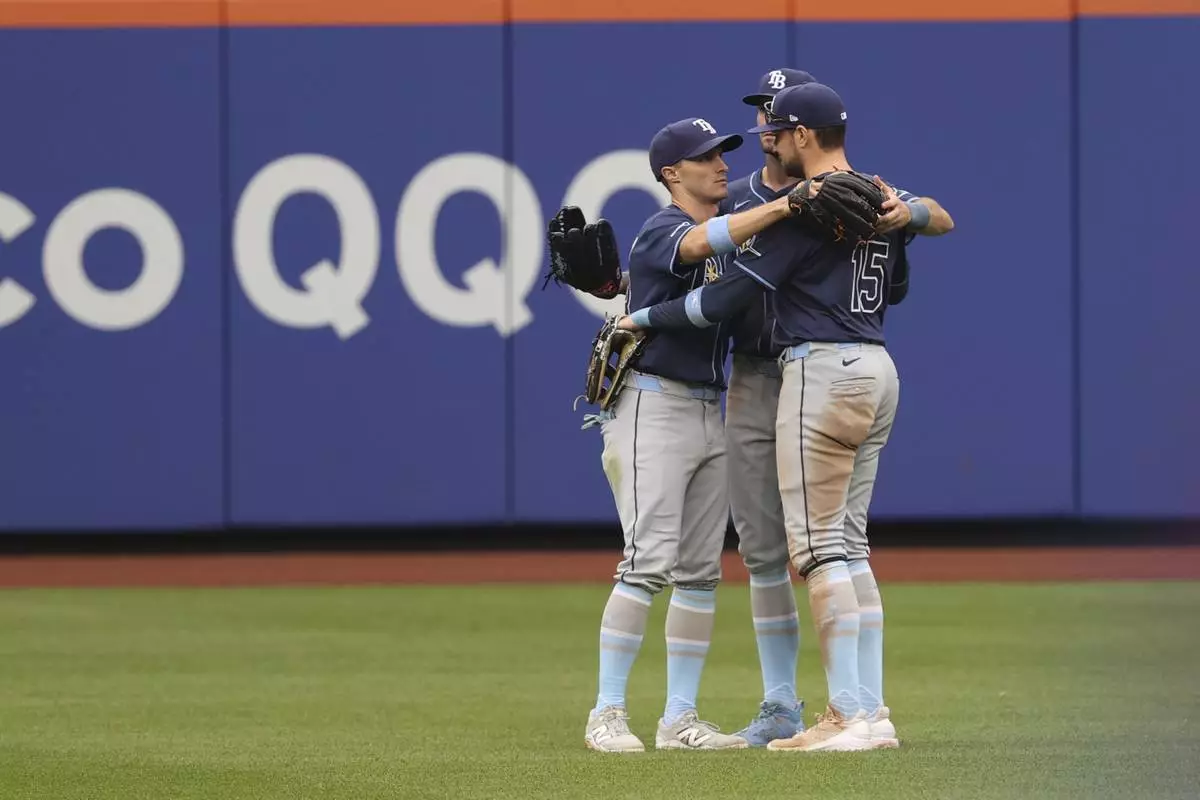 Tampa Bay Rays outfielders Jake Mangum, left, Kameron Misner, center, and Josh Lowe, right, react after defeating the New York Mets in a baseball game Sunday, June 15, 2025, in New York. (AP Photo/Pamela Smith)