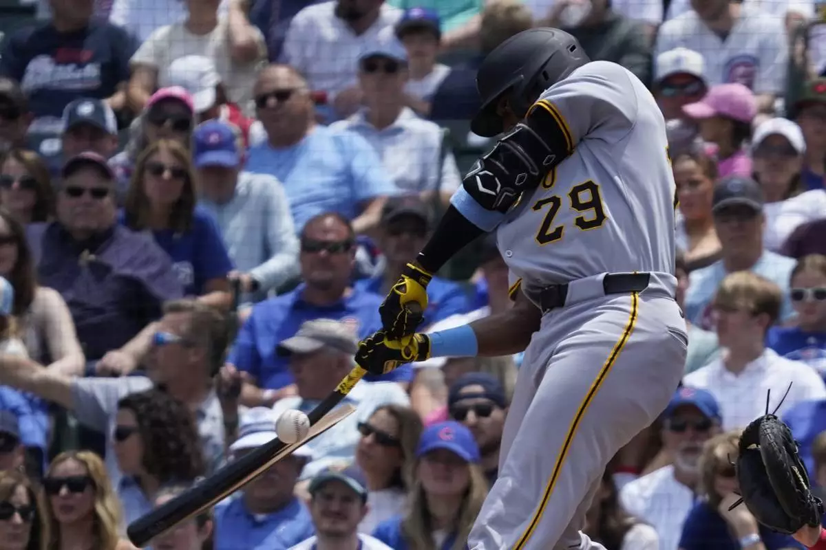 Pittsburgh Pirates' Alexander Canario hits a one-run groundout against the Chicago Cubs during the first inning of a baseball game Sunday, June 15, 2025, in Chicago. (AP Photo/David Banks)