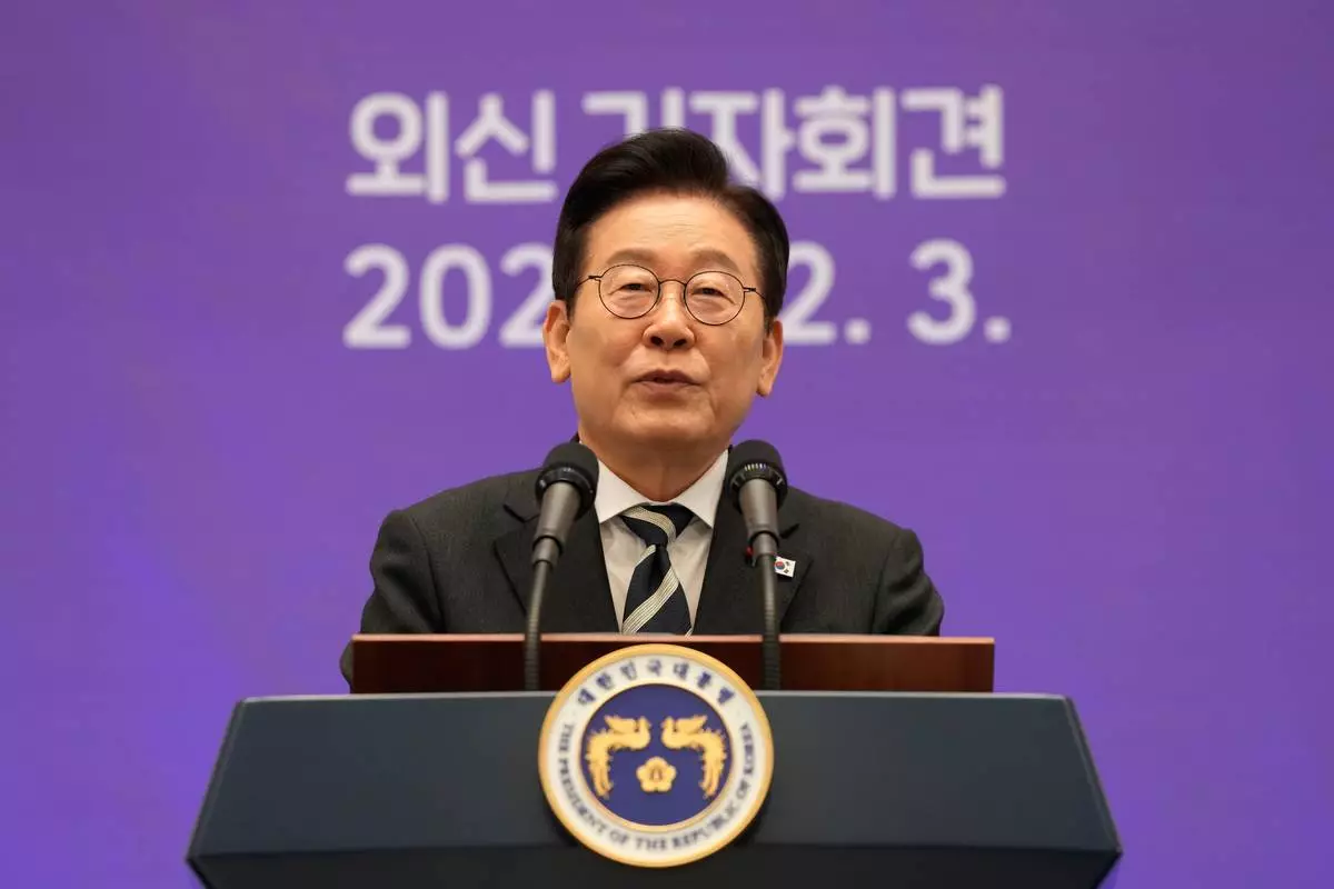 FILE - South Korean President Lee Jae Myung speaks during a news conference to mark the first anniversary of the Dec. 3 martial law crisis at the Blue House in Seoul, South Korea, Dec. 3, 2025. (AP Photo/Ahn Young-joon, File)