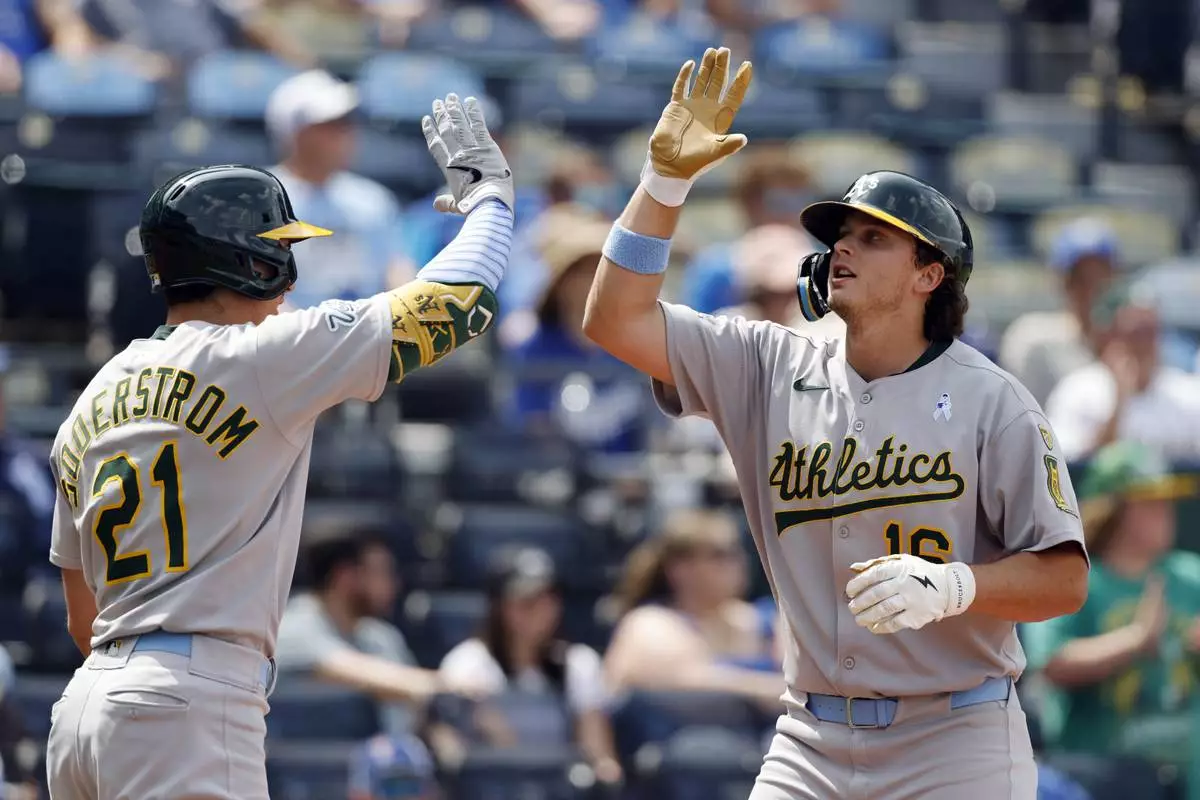 Athletics' Nick Kurtz, right, celebrates after hitting a home run with Tyler Soderstrom (21) as he crosses home plate during the ninth inning of a baseball game against the Kansas City Royals in Kansas City, Mo., Sunday, June 15, 2025. (AP Photo/Colin E. Braley)
