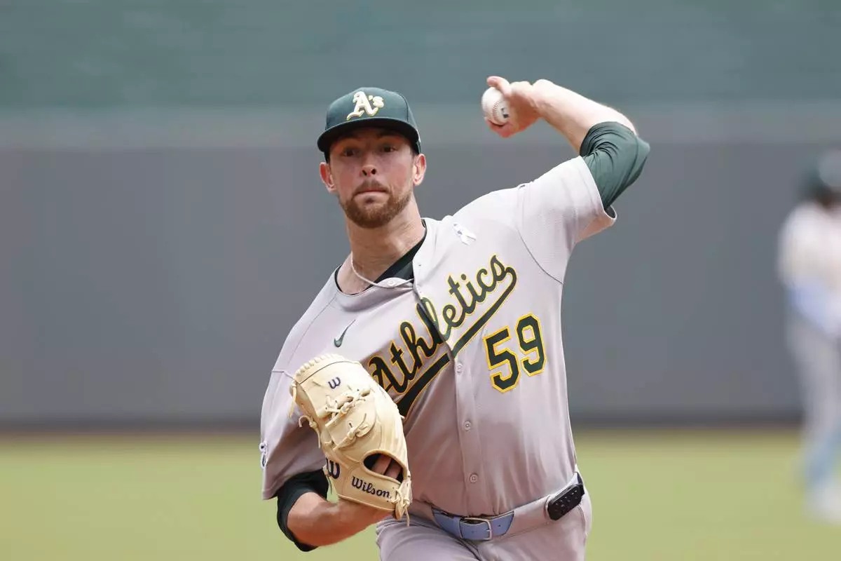 Athletics pitcher Jeffrey Springs throes from the mound during the first inning of a baseball game against the Kansas City Royals in Kansas City, Mo., Sunday, June 15, 2025. (AP Photo/Colin E. Braley)