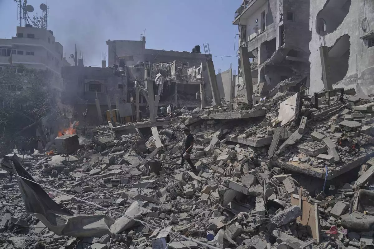 A Palestinian man walks across the rubble of a building destroyed by an Israeli strike in Deir al-Balah, central Gaza Strip, Monday, June 16, 2025. (AP Photo/Abdel Kareem Hana)