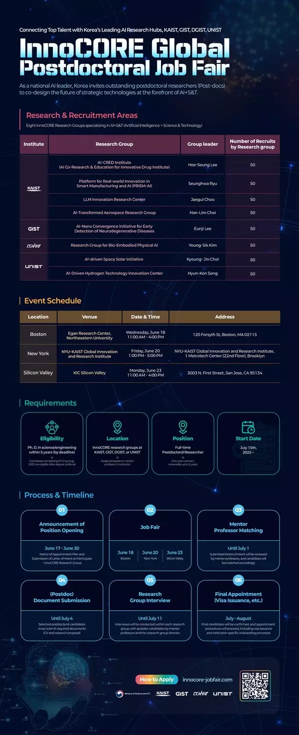 SEOUL, South Korea, June 16, 2025 /PRNewswire/ -- South Korea has announced a major national initiative to enhance its global competitiveness in AI-convergent science and technology (AI+S&T) by launching a large-scale international postdoctoral recruitment program. The Ministry of Science and ICT (MSIT), in collaboration with the country's four premier science and technology institutes—KAIST, GIST, DGIST, and UNIST—has officially unveiled the InnoCORE Postdoctoral Fellowship Program, a global initiative aiming to recruit 400 outstanding postdoctoral researchers.