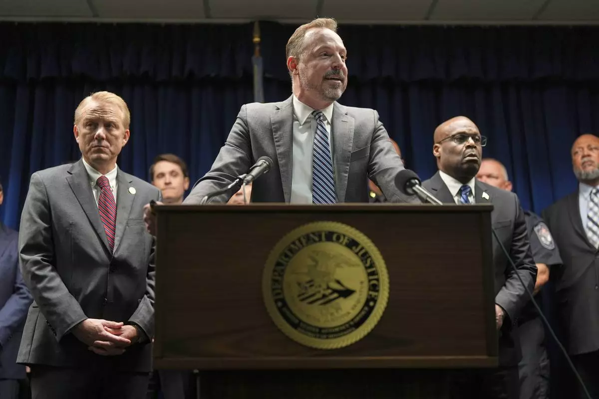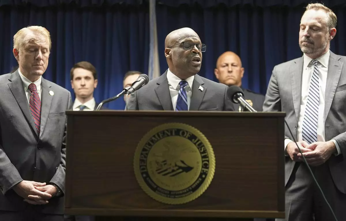 Acting U.S. Attorney Joseph H. Thompson speaks during a news conference at the United States Courthouse in Minneapolis, Monday, June 16, 2025. (AP Photo/George Walker IV)