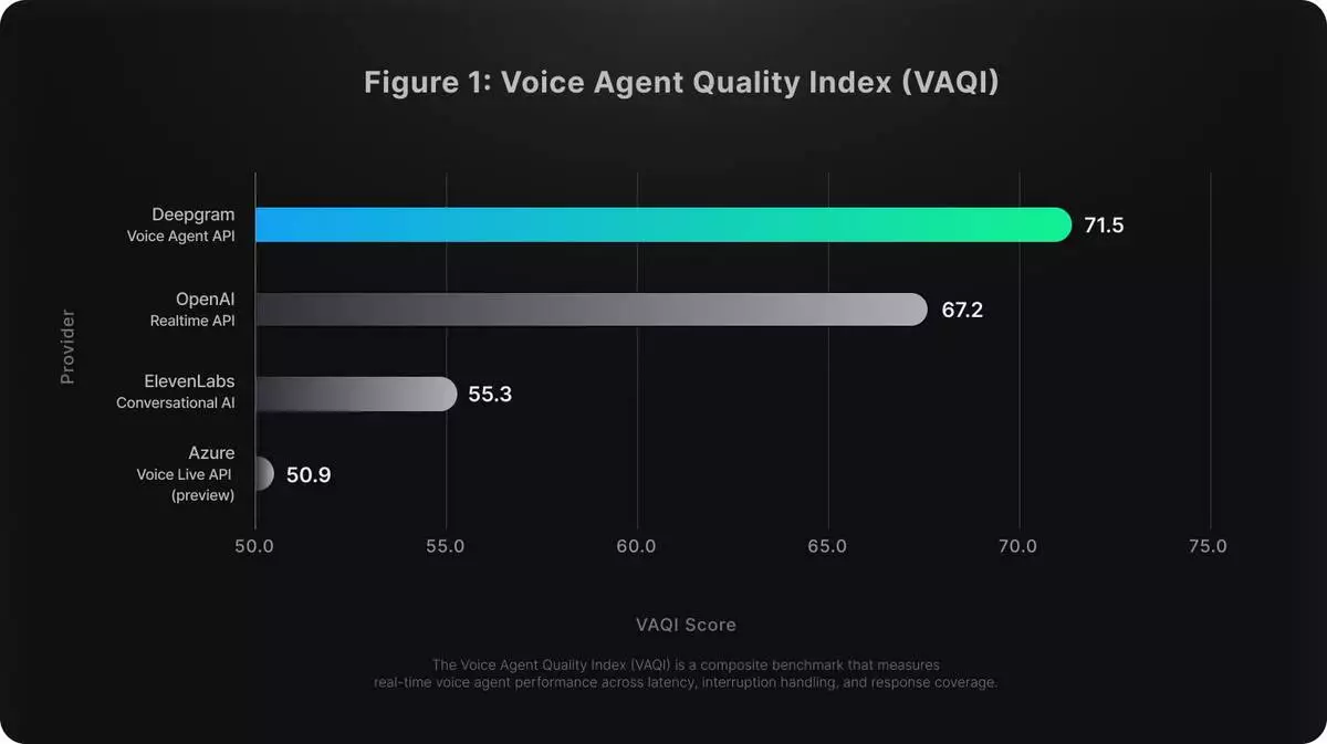 This tightly coordinated design translates directly into measurable performance gains. In recent benchmark testing using the Voice Agent Quality Index (VAQI), Deepgram achieved the highest overall score among all evaluated providers (see Figure 1). VAQI is a composite benchmark that measures the core elements of voice agent quality: latency (how quickly the agent responds), interruption rate (how often it cuts users off), and response coverage (how often it misses valid input).