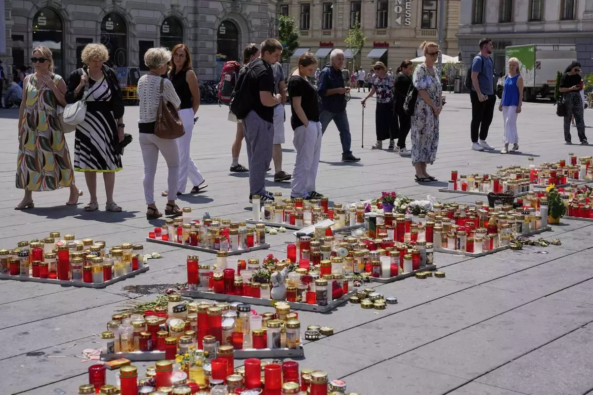 People commemorate the victims of a shooting at a school, where a former student opened fire two days before, at the central square in Graz, Austria, Thursday, June 12, 2025. (AP Photo/Darko Bandic)