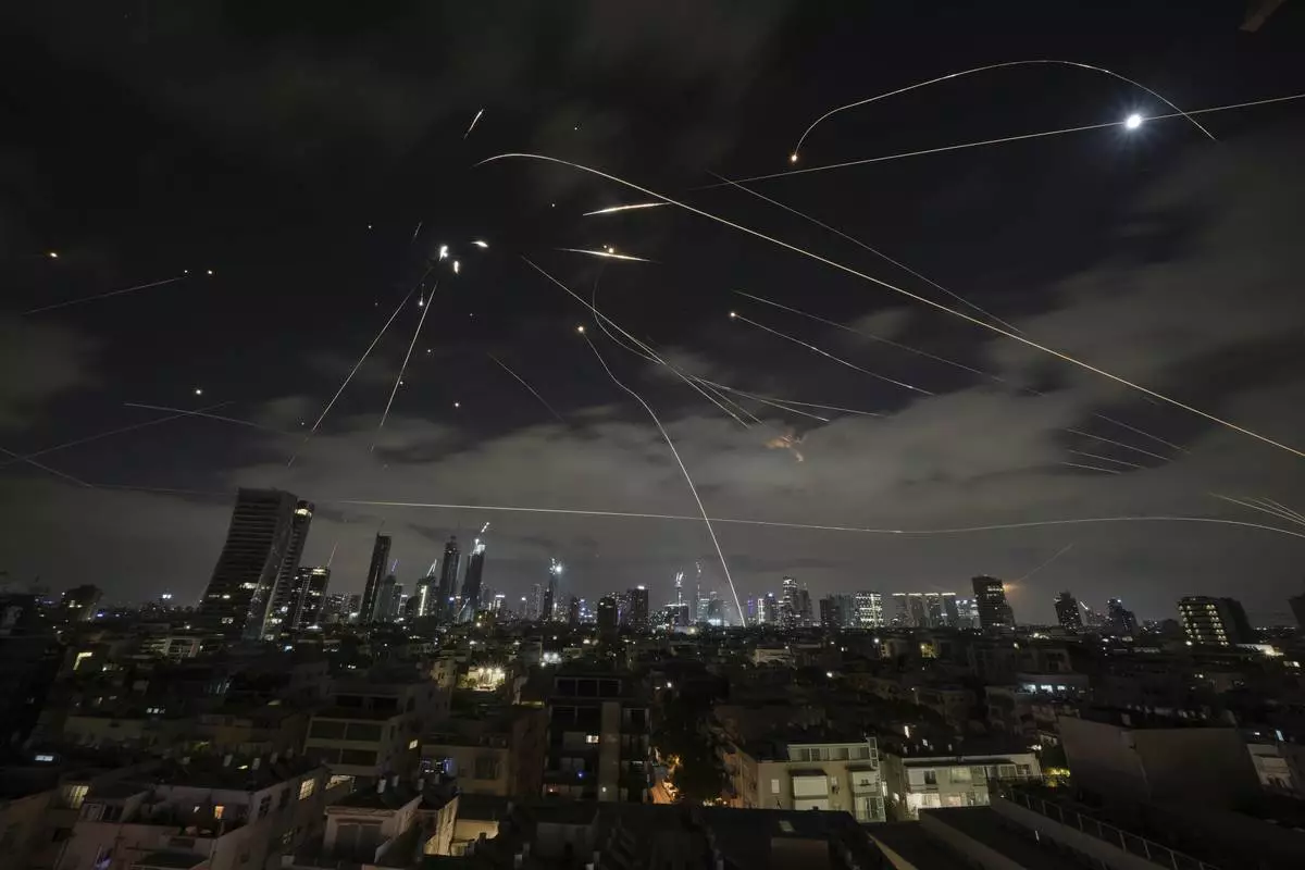 The Israeli Iron Dome air defense system fires to intercept missiles during an Iranian attack over Tel Aviv, Israel, Sunday, June 15, 2025. (AP Photo/Leo Correa)
