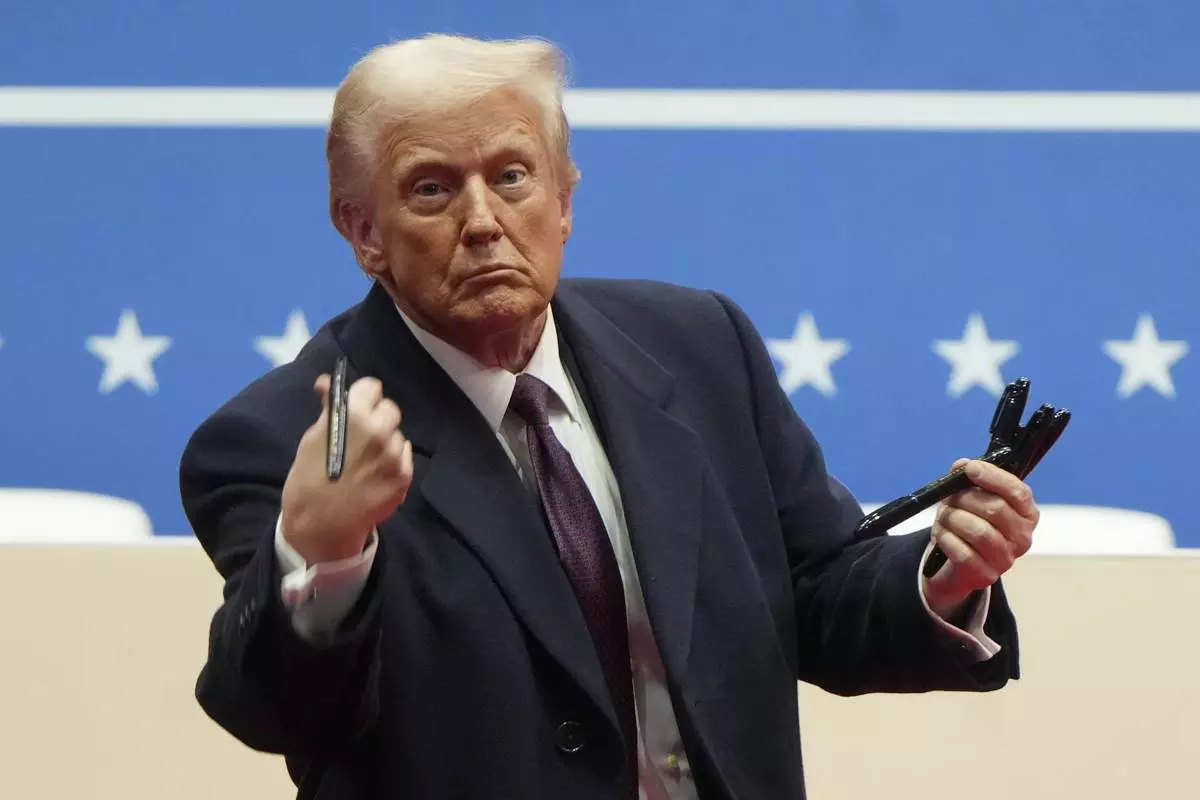 FILE - President Donald Trump throws pens used to sign executive orders to the crowd during an indoor Presidential Inauguration parade event in Washington, Jan. 20, 2025. (AP Photo/Matt Rourke, File)