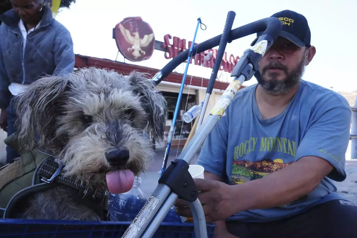 Immigrant Humberto Altamirano, with his dog, Dido, comments on the immigration enforcement in Los Angeles, Monday, June 16, 2025. (AP Photo/Damian Dovarganes)