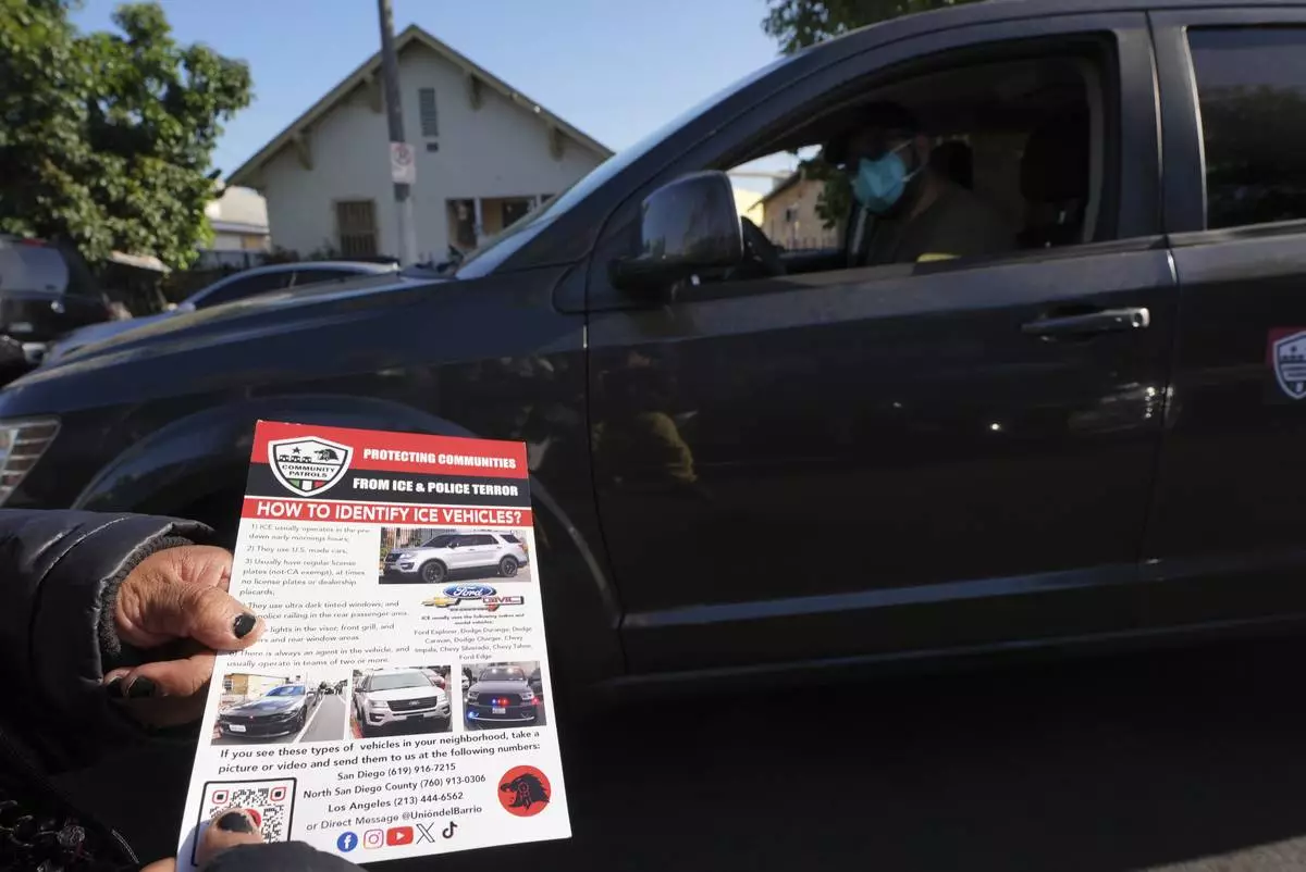 A member of the Union del Barrio, a grassroots political organization, distributes a "How to Identify ICE vehicles" flyer to people living in Los Angeles, Monday, June 16, 2025. (AP Photo/Damian Dovarganes)
