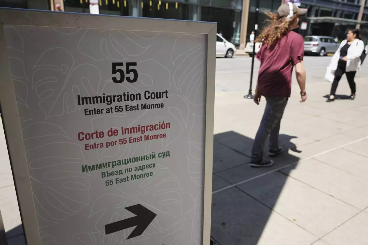 A sign of Immigration Court is displayed outside of Immigration Court, Monday, June 16, 2025, in Chicago. (AP Photo/Nam Y. Huh)