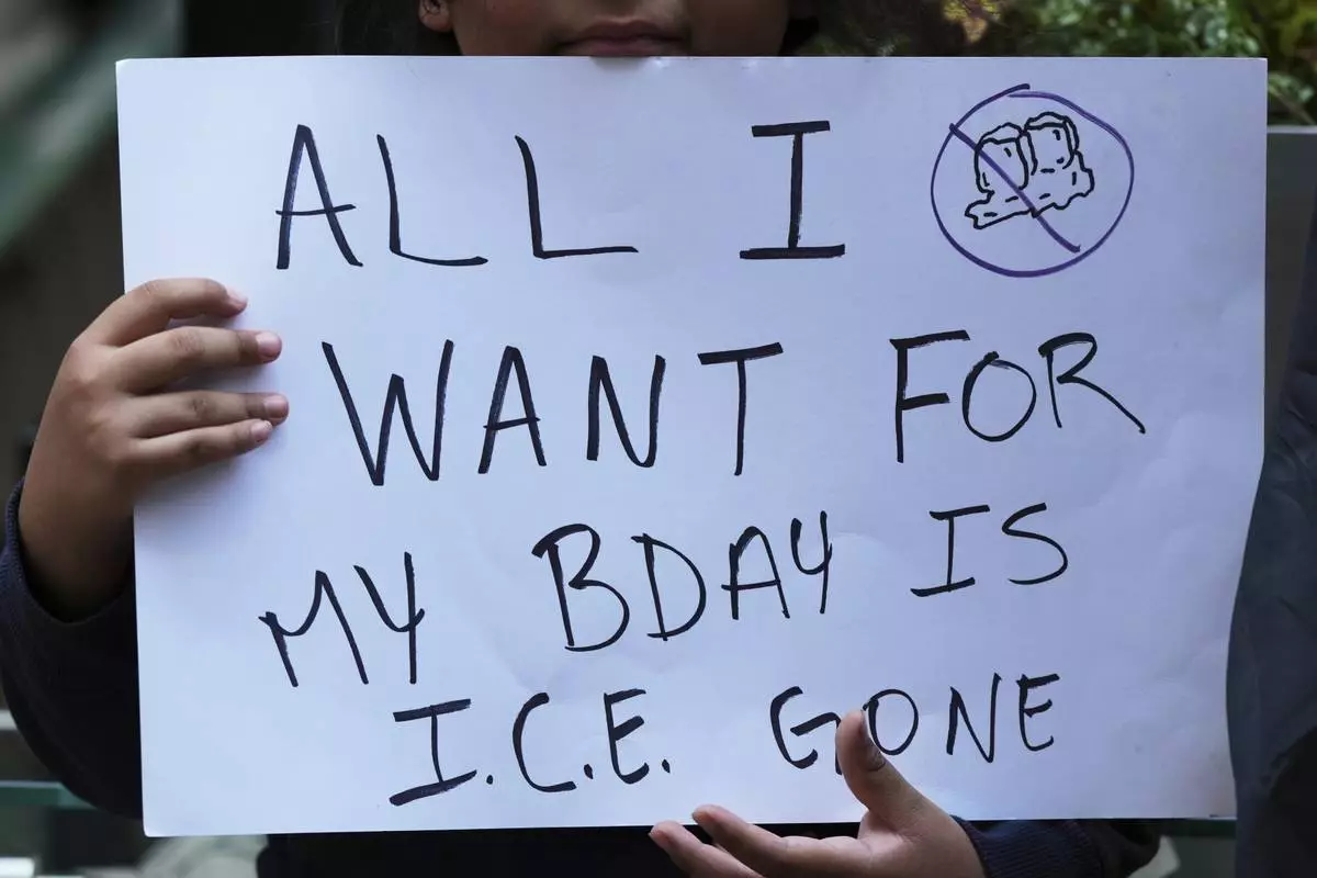 A demonstrator holds a sign outside of Immigration Court, Monday, June 16, 2025, in Chicago. (AP Photo/Nam Y. Huh)