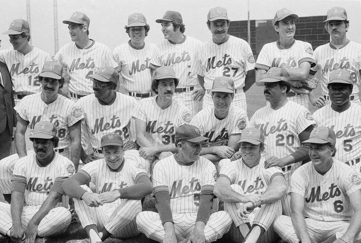 FILE - The 1969 New York Mets, pose for a 10th anniversary reunion photo at New York's Shea Stadium Saturday, July 14, 1979. Present at the Old Timers' Day were, top row, from left: Ken Boswell, Ron Taylor; Ron Swoboda, Ed Kranepool, Don Cardwell, Jim McAndrew, and Gary Gentry. Second row: Art Shamsky, Donn Clendenon, Jack DiLauro, J.C. Martin, Tommie Agee and Ed Charles. Third row: Cleon Jones, Joe Pinatano, Rube Walker, Jerry Grote, and Al Weis. (AP Photo/Bob Schutz,File)