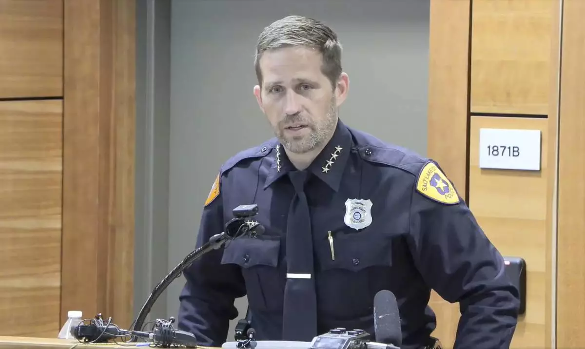 In this image taken from video provided by the Salt Lake City Police Department, Salt Lake City Police Chief Brian Redd speaks to the media during a press conference Sunday, June 15, 2025, about a June 14 shooting incident at a demonstration in Salt Lake City. (Salt Lake City Police Department via AP)