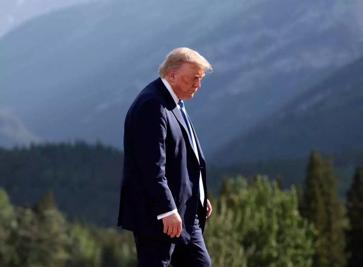 U.S. President Donald Trump leaves after a family photo session during the G7 Summit, in Kananaskis, Alberta, Monday, June 16, 2025. (Suzanne Plunkett/Pool Photo via AP)