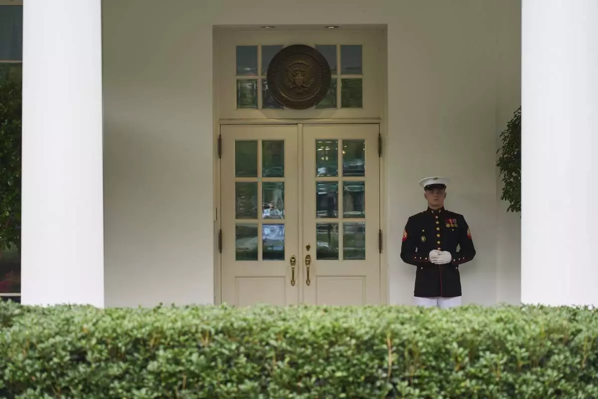 A U.S. Marine stands outside the entrance to the West Wing of the White House as President Donald Trump meets in the Situation Room, Tuesday, June 17, 2025, in Washington. (AP Photo/Evan Vucci)