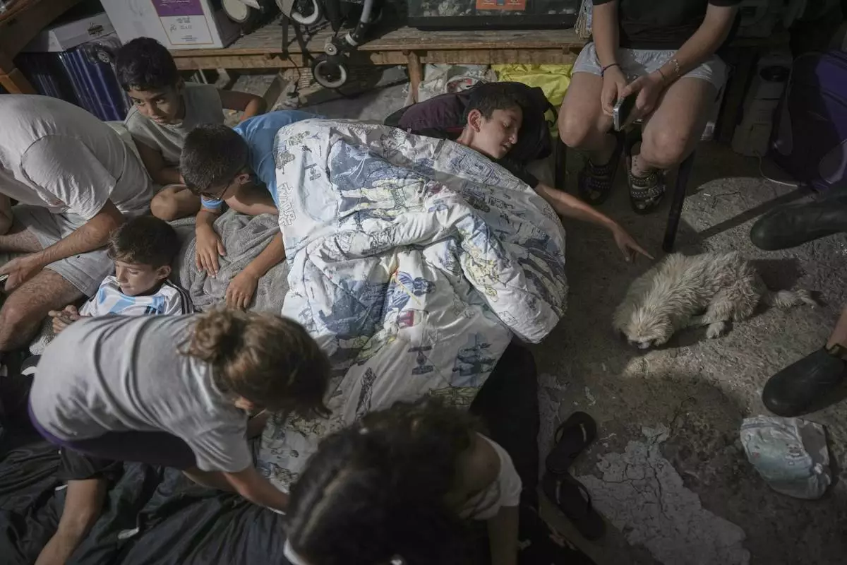 Israeli children take shelter during air raid sirens warning of incoming strikes by Iran, in Bnei Brak, near Tel Aviv, Israel, Tuesday, June 17, 2025. (AP Photo/Oded Balilty)