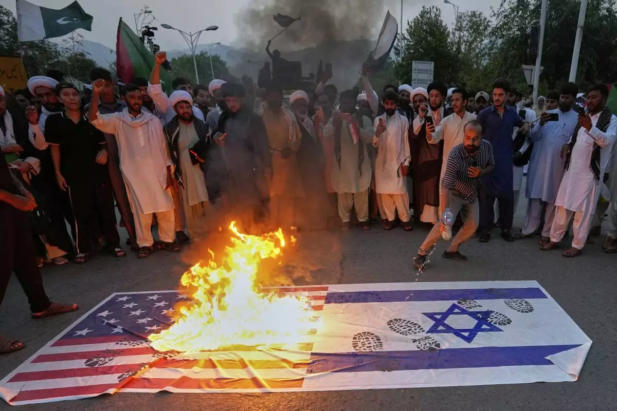 Shiite Muslims burn representations of U.S. and Israeli flags during a rally to condemn Israeli strikes on Iran, in Islamabad, Pakistan, Tuesday, June 17, 2025. (AP Photo/Anjum Naveed)
