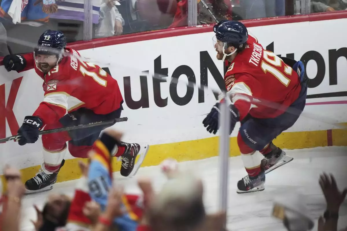 Florida Panthers' Sam Reinhart (13) celebrates after his goal against the Edmonton Oilers with teammate Matthew Tkachuk (19) during the third period in Game 4 of the NHL hockey Stanley Cup Final in Sunrise, Fla., Thursday, June 12, 2025. (Nathan Denette/The Canadian Press via AP)