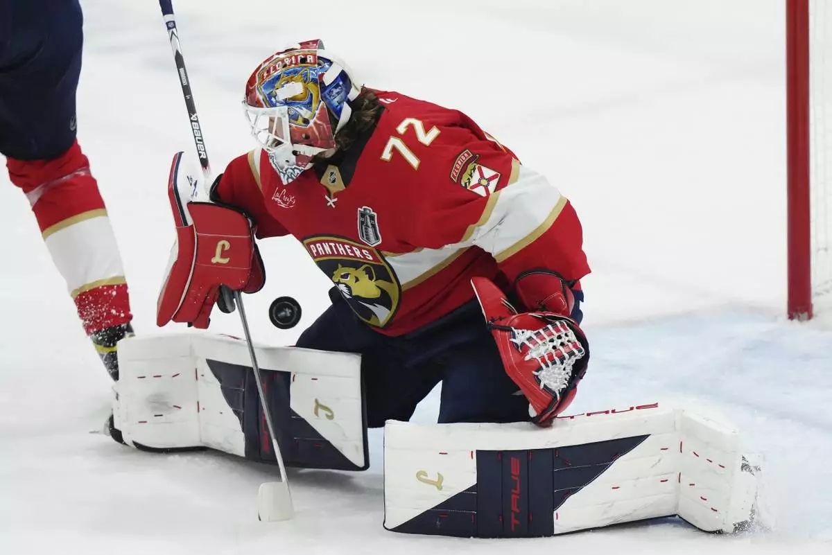 Florida Panthers goalie Sergei Bobrovsky (72) makes a save against the Edmonton Oilers during the first period in Game 6 of the NHL hockey Stanley Cup Final in Sunrise, Fla., Tuesday, June 17, 2025. (Nathan Denette/The Canadian Press via AP)