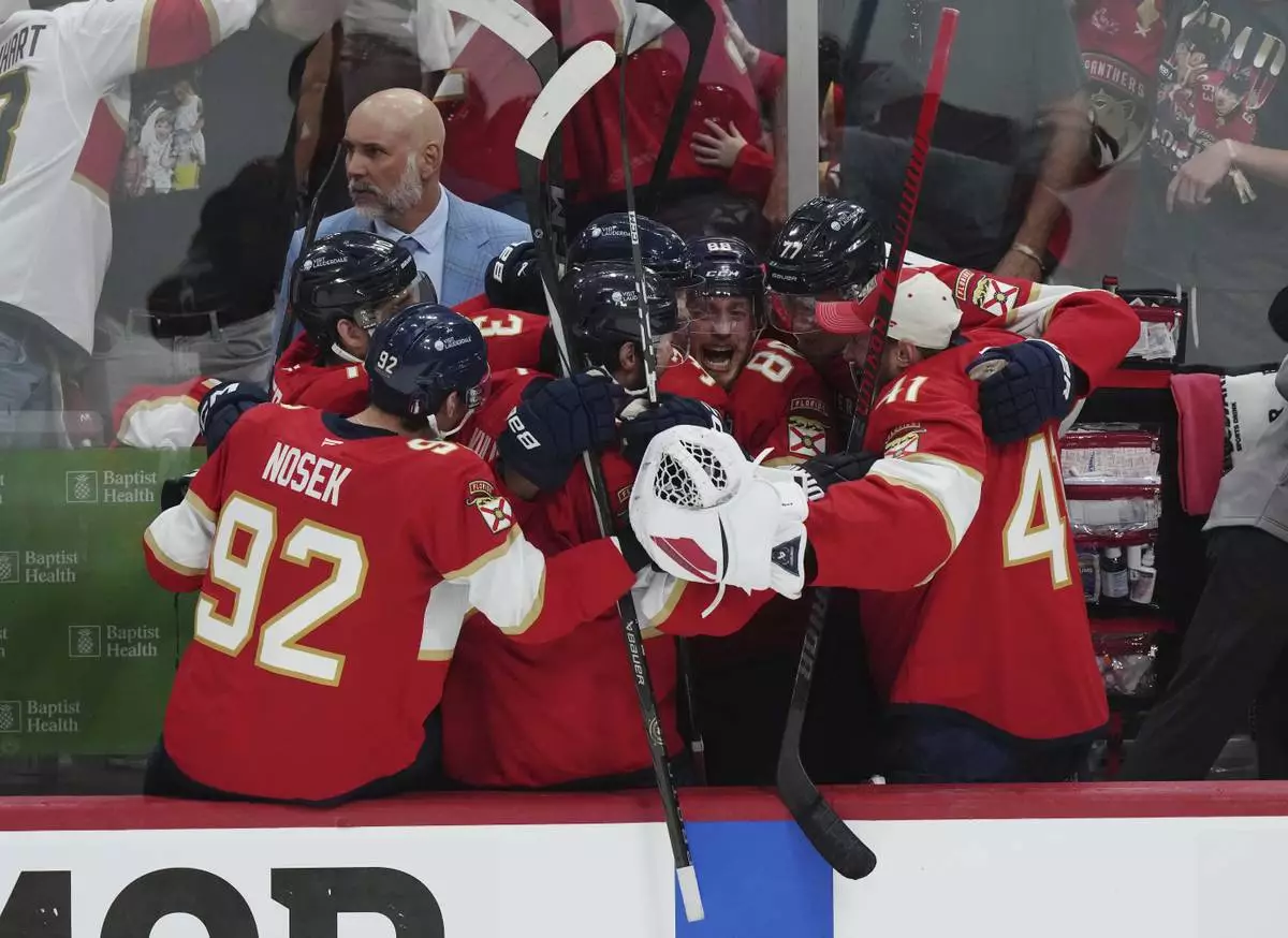 Florida Panthers players celebrate an empty net goal against the Edmonton Oilers during the third period in Game 6 of the NHL hockey Stanley Cup Final in Sunrise, Fla., Tuesday, June 17, 2025. (Nathan Denette/The Canadian Press via AP)